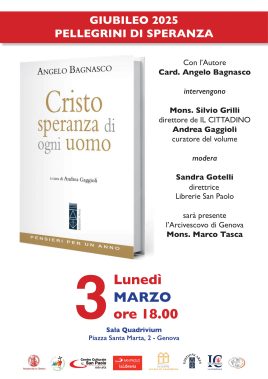 Lunedì 3 marzo, alle ore 18 alla sala Quadrivium (piazza Santa Marta 2) di Genova, a cura della Libreria San Paolo è in programma la presentazione del libro del card. Angelo Bagnasco “Cristo speranza di ogni uomo”. Il volume presenta – in 180 pagine – 365 pensieri, uno per ogni giorno dell’anno. “I brani – precisa una nota della diocesi – sono tratti dall’ampio magistero del cardinale e hanno come filo conduttore la speranza, tema al centro del Giubileo 2025”. I testi proposti sono estratti dagli interventi del cardinale dal 1998 al 2023 e ripercorrono tutti gli anni del suo episcopato a Pesaro, a Genova, come presidente della Cei e del Ccee (Consiglio delle Conferenze episcopali d’Europa). Con il cardinale Angelo Bagnasco intervengono alla presentazione mons. Silvio Grilli, direttore de Il Cittadino e Andrea Gaggioli, curatore del volume. Modera Sandra Gotelli, direttrice delle Librerie San Paolo. Sarà presente mons. Marco Tasca, arcivescovo di Genova.