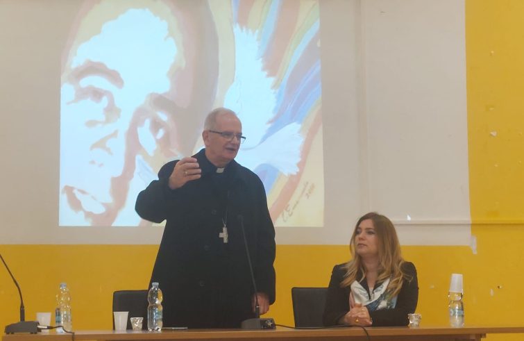 Il vescovo ha presentato ai ragazzi la figura del giovane sacerdote come animato da una viva, inquieta ricerca di fede, contemporaneamente proteso alla ricerca delle vie migliori per il bene della comunità. Egli ha espresso apprezzamento per la via intrapresa nella scuola in cui le classi s’impegnano, con responsabilità diretta degli studenti, a “essere comunità”, il che significa, nelle parole del vescovo, “essere attenti gli uni agli altri, guardare al bene delle persone, innanzitutto alla loro vita. E questa è la via che davvero don Peppe avrebbe desiderato per tutti”.