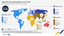 The number of asylum applicants in the EU dropped by 13%. Indeed, the data for 2024 released by Eurostat today show a drop in applications to 912,000 in 2024 compared to 1,049,500 in 2023. These figures refer to non-EU nationals who have applied for international protection in the EU for the first time. Syrians are the largest group with 148,000 applications (16% of the total), followed by Venezuelans with 72,800 applications (8% of the total) and Afghans with 72,200 applications (8%). 82% of all applications are submitted in 5 EU countries: Germany remains the country with the highest number of applications lodged (229,700, 25% of the total), followed by Spain (164,100, 17%). Italy ranks third (151,000, 18%), followed by France (130,900, 14%) and Greece (69,000, 8%). However, when considering applications per thousand inhabitants, Cyprus tops the list (with 7.2 applicants per 1,000 people), followed by Greece (6.6), Ireland and Spain (each 3.4) and Luxembourg (3.2). In addition to the over 900,000 adults who applied for asylum, 36,300 unaccompanied minors also sought protection in the EU in 2024. Here again, Syrians were the largest group (11,600 people, 32%), followed by Afghans (5,700, 16%), Egyptians (3,000, 8%), Somalis (2,400, 7%) and Guineans (1,300, 4%). Their applications were lodged in Germany (13,300, 37% of the total), the Netherlands (4,300, 12%), Greece (4,000, 11%), Spain (3,300, 9%) and Bulgaria (2,600, 7%).