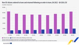 124,935 non-EU citizens were ordered to leave an EU country and 28,630 were actually returned to third countries in the fourth quarter of 2024. These figures, published today by the European Statistical Office Eurostat, show an increase in comparison both with the previous three months (+11.5% in orders to leave and +3.3% in actual returns) and with the same quarter of 2023 (+16.3% and +24.3% respectively). Most of the orders to leave were issued to Algerians (11,362), Syrians (8,674) and Moroccans (8,561), but the majority of those returned were from Georgia (3,351), Turkey (2,492) and Albania (1,982). The highest numbers of orders to leave were issued by France (31,880), Spain (18,645) and Germany (15,135), while the highest numbers of people returned to third countries were recorded in Germany (6,170), France (3,705), and Sweden (2,600). In the fourth quarter of 2024, Italy issued 7,515 orders to leave and 1,265 people were actually pushed back across the EU’s borders by the Italian authorities.