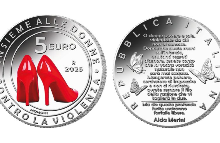 La potenza delle parole, dure e inflessibili, di Alda Merini. La luce brillante del rosso delle scarpe rosse. La moneta dedicata al contrasto della violenza contro le donne apre uno squarcio – come quello che l’artista-incisora Claudia Momoni ha riportato sul dritto della moneta, prima degli ultimi versi della poesia di Alda Merini iscritta – e chiede con forza: libertà!