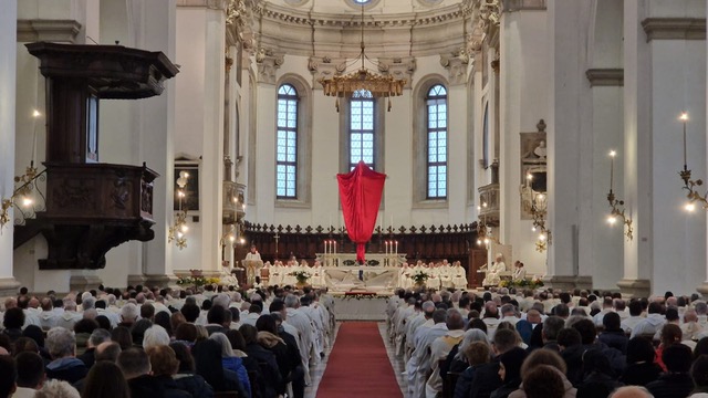 Oggi, Giovedì Santo, il vescovo di Padova Claudio Cipolla ha presieduto in una basilica cattedrale colma di presbiteri, diaconi, religiosi/e e fedeli, la solenne Messa del crisma, durante la quale i ministri ordinati hanno rinnovato le promesse sacerdotali e sono stati consacrati gli oli santi: il crisma, l’olio dei catecumeni, l’olio degli infermi, che verranno utilizzati durante l’anno per la celebrazione di Battesimo, Cresima, Ordine sacro e Unzione degli infermi. Le offerte raccolte vanno a sostenere il progetto diocesano “Vi sia uguaglianza, segno concreto di carità proposto nel tempo del Giubileo. Tra i concelebranti anche il vescovo emerito Antonio Mattiazzo e il vescovo eletto di Vittorio Veneto Riccardo Battocchio, che domenica 25 maggio sarà consacrato vescovo e farà l’ingresso nella nuova diocesi.