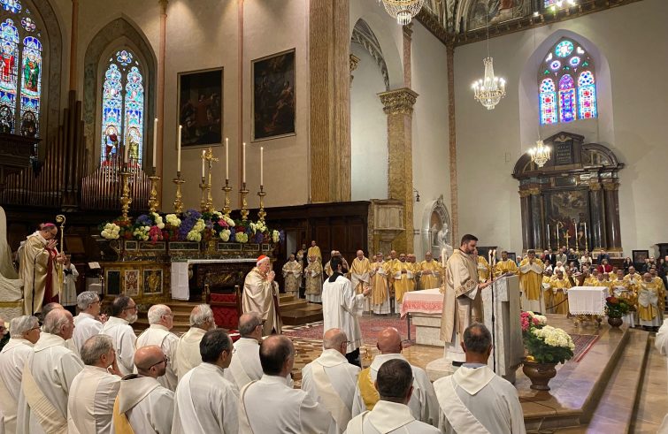 La Messa crismale è stata presieduta dall’arcivescovo insieme al card. Gualtiero Bassetti, arcivescovo emerito di Perugia-Città della Pieve, celebrazione in cui i sacerdoti hanno rinnovato le promesse formulate alla loro ordinazione presbiterale prima della consacrazione degli oli santi portati da diaconi e laici all’altare. La Messa è stata preceduta dalla processione dei celebranti che ha percorso il perimetro esterno della cattedrale facendo ingresso dalla porta giubilare. Il libro del Vangelo è stato portato dal seminarista Samuele Bette che sarà ordinato sacerdote il prossimo 28 giugno. La celebrazione è iniziata con il saluto introduttivo del vicario generale don Simone Sorbaioli. Nel ricordare i particolari anniversari di sacerdozio di alcuni confratelli e quanti nell’ultimo anno sono tornati alla Casa del Padre, il vicario, don Sorbaioli, ha sottolineato la vitalità della Chiesa diocesana in ambito vocazionale con 5 seminaristi in Teologia, 4 giovani che frequentano l’anno propedeutico ed altri in discernimento prima di entrare in Seminario.