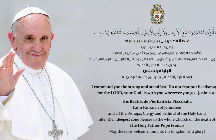 “Ti ho comandato: sii forte e coraggioso. Non temere e non spaventarti, perché è con te il Signore tuo Dio, dovunque tu vada”: con le parole del libro di Giosuè (1,9) il Patriarcato latino di Gerusalemme esprime le condoglianze per la morte di Papa Francesco. Le parole tratte dalla Bibbia (in inglese e arabo) sono accompagnate dall’immagine di Papa Francesco benedicente. Nel testo si legge: “Sua Beatitudine Pierbattista Pizzaballa, patriarca latino di Gerusalemme, tutti i vescovi, il clero e i fedeli della Terra Santa, offrono le loro più sentite condoglianze all’intera Chiesa per la morte del Santo Padre, Papa Francesco. Possa il Signore accoglierlo nel suo regno e nella sua gloria”.