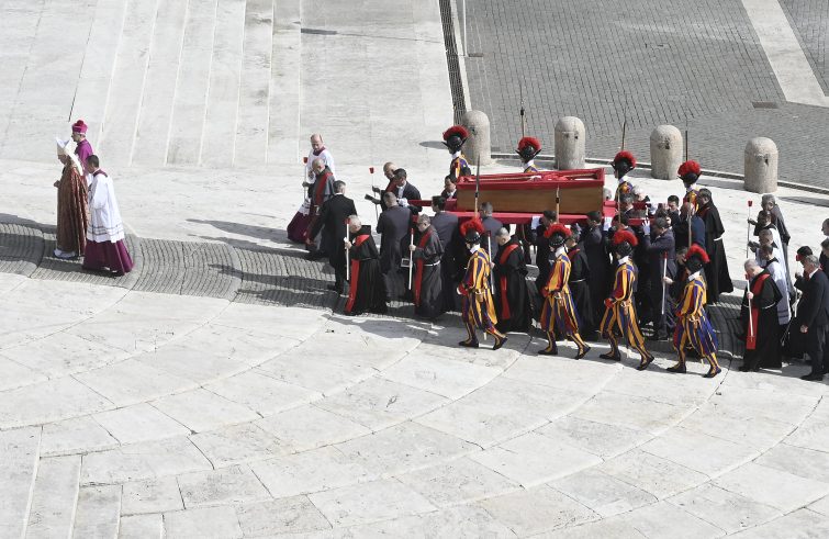 La bara con il corpo di Papa Francesco è stata collocata ai piedi dell’altare della Confessione, grazie all’aiuto dei sediari pontifici che l’hanno deposta su un’apposita pedana leggermente sopraelevata, e non su un catafalco, come avveniva per gli altri Pontefici e come aveva disposto lo stesso Bergoglio, modificando l’“Ordo exsequiarum Romani Pontificis”. Davanti al feretro, il cardinale camerlengo, Kevin Joseph Farrell, che ha asperso la bara con l’acqua benedetta e fra poco presiederà la liturgia della Parola. Ai primi banchi, sui due lati, i cardinali e i vescovi, i sacerdoti che riempiono la basilica per quello che di fatto è il secondo atto del rito delle esequie. A fare da sfondo, il canto delle litanie dei santi.