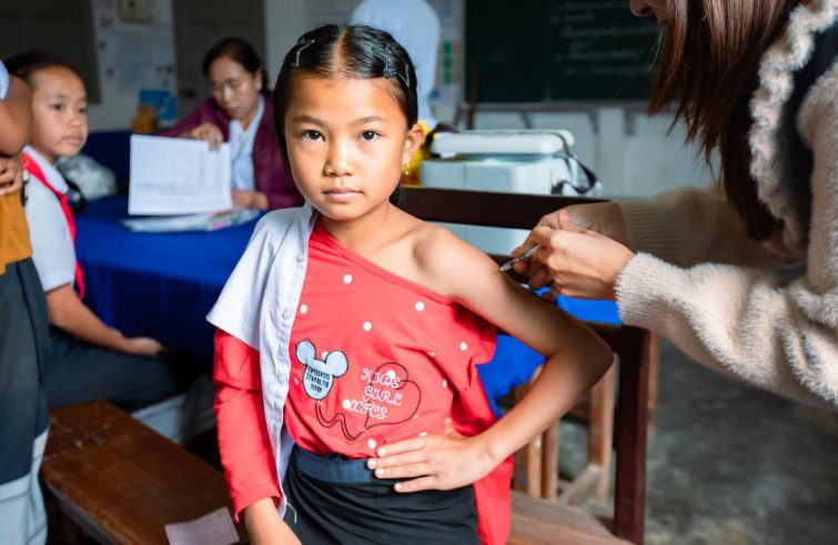 On November 27, 2024, a young girl receives the HPV vaccine at the Saiylom Primary and Secondary School in Paek District, Xiengkhouang Province.