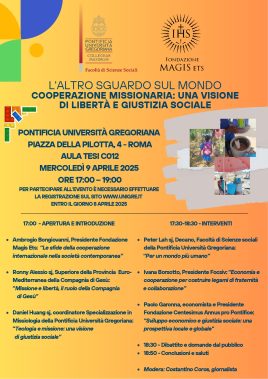 In un’epoca segnata da disuguaglianze crescenti e fragilità globali, il tema della cooperazione missionaria si pone come una chiave di lettura essenziale per costruire un mondo più equo e solidale. Per approfondire tali questioni la Fondazione Magis ha organizzato, in collaborazione con la Facoltà di Scienze Sociali della Pontificia Università Gregoriana, un incontro sul tema “L’altro sguardo sul mondo. Cooperazione missionaria: una visione di libertà e giustizia sociale” che si terrà mercoledì 9 aprile presso la Pontificia Università Gregoriana a Roma. “Sarà un’occasione di confronto arricchita con voci autorevoli che offriranno prospettive diverse ma complementari. Dalla riflessione teologica sulla missione e la giustizia sociale, guidata da esperti della Compagnia di Gesù, fino alla dimensione economica della cooperazione, il dibattito – spiega una nota – cercherà di delineare nuove strade per un futuro orientato all’attenzione verso i poveri in una prospettiva di bene comune”. L’evento vedrà interventi che esploreranno il legame tra economia e fraternità, le sfide della cooperazione internazionale nella società contemporanea, il rapporto tra teologia e missione in una visione di libertà e giustizia sociale per costruire un mondo più umano. Non mancherà l’analisi del rapporto tra questioni riguardanti l’economia dello sviluppo e la giustizia sociale, secondo una dimensione locale e globale. In un tempo in cui le sfide internazionali richiedono risposte comuni, questo incontro rappresenta “un’opportunità per riflettere su come la cooperazione missionaria, la teologia e l’economia possano collaborare verso una visione condivisa di libertà e giustizia sociale al fine di contribuire alla costruzione della pace. La serata si concluderà con un dibattito aperto al pubblico, offrendo uno spazio di dialogo e condivisione”.