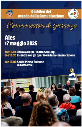 È in programma per sabato 17 maggio ad Ales, dalle ore 16 nel Cineteatro San Luigi, il Giubileo diocesano del mondo della comunicazione, dal tema “Comunicatori di speranza”. Alle ore 16 in programma il caffè di benvenuto, mentre alle ore 16,30 l’incontro con gli operatori della comunicazione, seguito alle ore 18 dalla messa in cattedrale. “Sarà un’occasione per ascoltare esperienze di vita, testimonianze di fede e di speranza”, si legge nel comunicato diffuso dalla diocesi di Ales-Terralba per l’occasione: “Avremo la possibilità di conoscere storie ma anche buone prassi; parleremo di buona comunicazione, di una comunicazione che dà speranza fatta con speranza”.