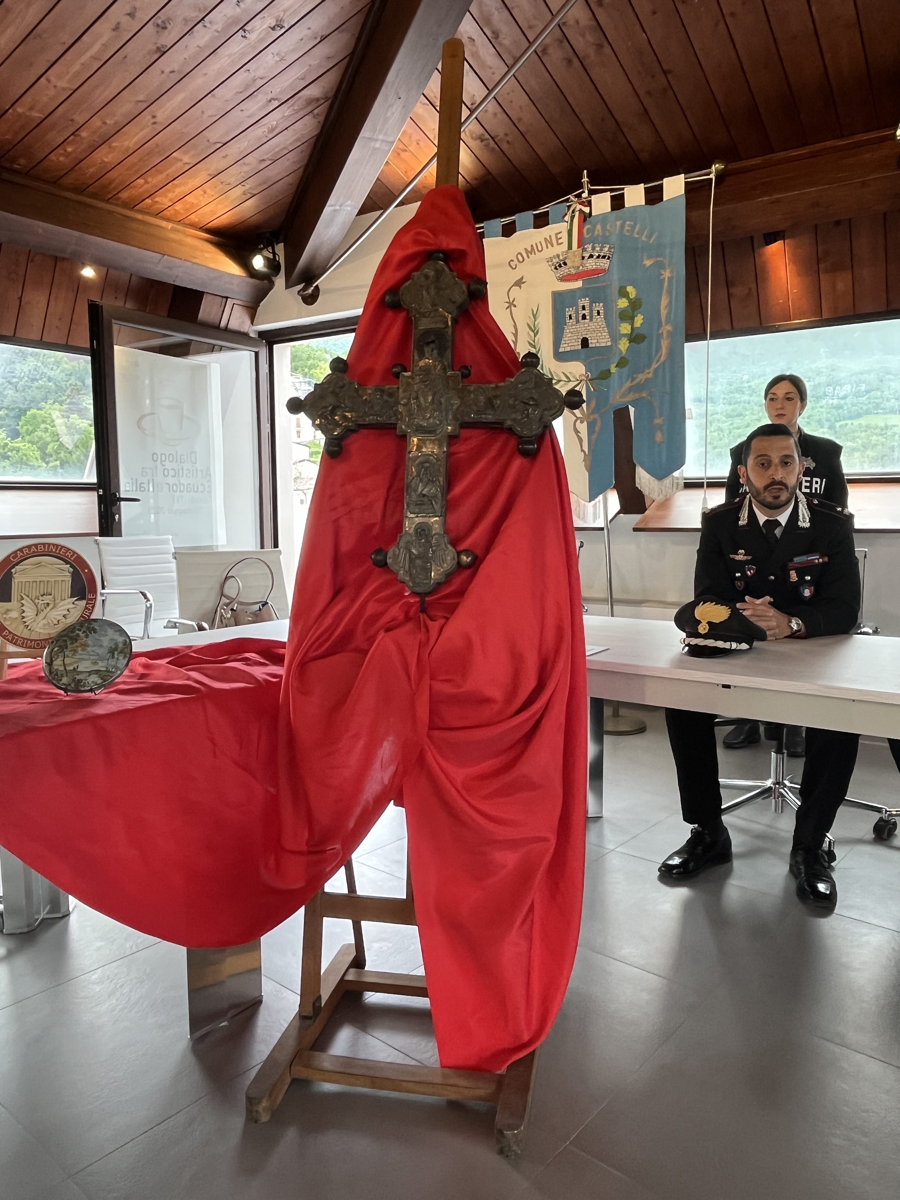 Questa mattina nel Comune di Castelli, i Carabinieri della Sezione antiquariato del Reparto operativo per la tutela del patrimonio culturale, hanno restituito alla comunità castellana e alla Chiesa diocesana la croce processionale in argento del XIII sec., proveniente dall’Abbazia di San Salvatore a Castelli, oltre a due pregiati e antichi tondi in maiolica policroma rubati nel 1977 dalla raccolta civica di Castelli. I beni sono stati recuperati grazie alle indagini condotte dai Carabinieri, dopo la segnalazione dello storico dell’arte Valentino Pace, della presenza nel Museo di Sant’Agostino di Genova della croce astile in lamina d’argento e terminazioni trilobate scomparsa da Castelli. La croce, insieme ai frammenti dell’ambone e la statua lignea della Madonna con bambino, rappresentano le uniche reliquie della scomparsa Abbazia di San Salvatore, e sono tra le opere artistiche più antiche e preziose del contesto della Valle Siciliana o del Mavone. Recuperata fortunosamente a seguito dell’abbandono e del veloce decadimento del complesso per cui era stata creata, è sempre rimasta in custodia della chiesa parrocchiale di San Giovanni, ed utilizzata in occasioni speciali e ricorrenze che vedevano la partecipazione dell’intera comunità. Erano presenti alla riconsegna degli oggetti storici il maggiore Alberto Calabria, comandante Nucleo Tpc dell’Aquila, mons. Lorenzo Leuzzi, vescovo della diocesi di Teramo-Atri, don Franco D’Angelo, parroco di Castelli, Alessia Di Stefano, assessore alla Cultura del comune di Castelli, Antonio David Fiore, funzionario Soprintendenza, Paola Di Felice e Giuseppe Matricardi, rispettivamente direttrice e presidente del Museo delle Ceramiche di Castelli.
