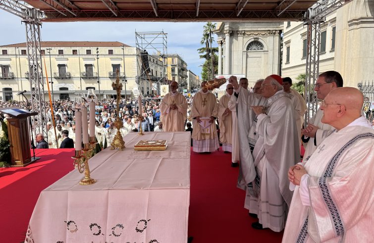 “Qui nel centro spirituale di Pompei, voluto da Bartolo Longo, che a breve sarà festeggiato come Santo nel mondo intero, le parole che sono risuonate nel Vangelo ci portano col pensiero e col cuore a Nazareth, che allora era un villaggio in una provincia marginale dell’Impero romano, mentre in questi giorni invece è in una zona straziata da un’orribile guerra con innumerevoli morti e distruzioni”. Lo ha ricordato, stamattina, il card. Giovanni Battista re, decano del Collegio cardinalizio, all’inizio dell’omelia della messa da lui presieduta a Pompei, in occasione della supplica alla Madonna dell’8 maggio.