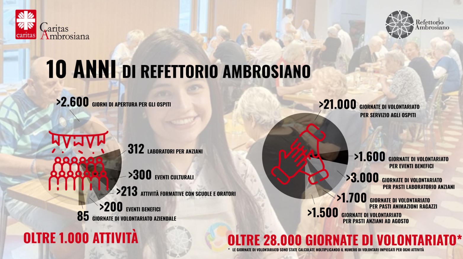 Non solo una scodella di minestra e non solo una mensa. Potrebbe essere questa la sintesi dell’impegno profuso da Caritas ambrosiana nell’immaginare e gestire il Refettorio Ambrosiano nato 10 anni fa. Così come lo ha illustrato nel suo intervento per il decennale, il direttore Luciano Gualzetti: “La lotta alla fame e alla povertà alimentare ha costituito un primo, immediato impegno e l’eredità più esplicita di Expo 2015. Ma non avremmo fatto un buon servizio ai poveri e a Milano, se ci fossimo limitati a scodellare minestre o risotti. Con il Refettorio abbiamo offerto 3 risposte, affermando, in concreto, che il diritto al cibo deve essere diritto a un’alimentazione di qualità. In secondo luogo, abbiamo condotto una lotta allo spreco alimentare e delle risorse, anche energetiche, sempre più accurata: non c’è contrasto delle povertà, se non c’è contrasto delle cattive abitudini di consumo che contribuiscono a generarla”. Infine, la mission più complessiva di Caritas, esemplificata nell’attività quotidiana del Refettorio. “Il Refettorio è diventato punto di riferimento per tanti anziani soli e fragili: il nostro impegno per la promozione della dignità umana cerca di farsi carico di tutte le fatiche espresse dalla città, per scongiurare inaccettabili guerre tra poveri”. E questo con lo sforzo di fare del Refettorio un propulsore di cultura e formazione. “Caritas è convinta che chi è povero ambisce a un nutrimento spirituale, oltre che materiale. Anche perché, come sempre, rifiutiamo uno schema di delega, ma sollecitiamo l’intera comunità, religiosa e civile, a farsi carico della sorte di tutti e di ciascuno. È questione di giustizia sociale e di autentica fraternità”.
