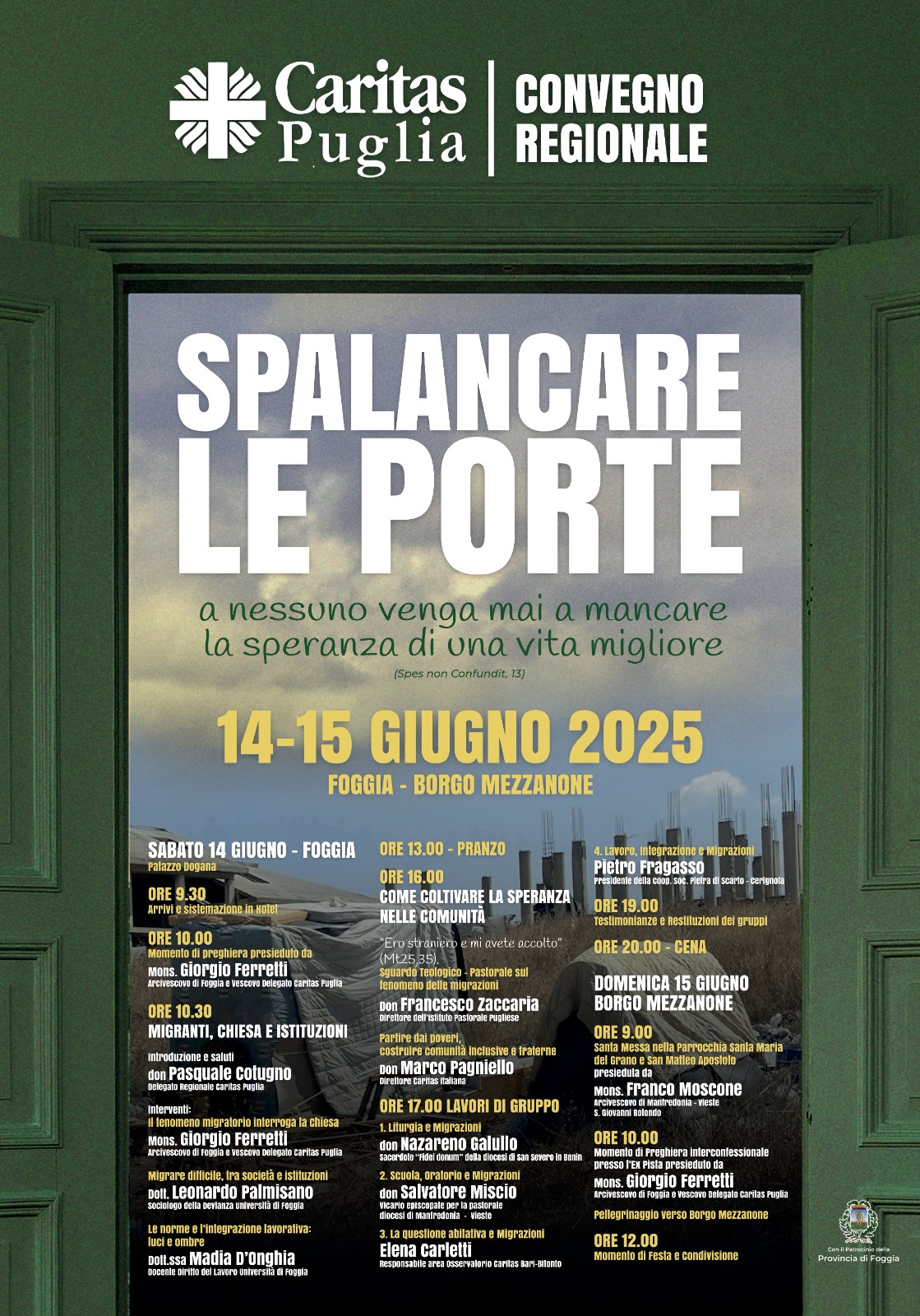 Si svolgerà il 14 e 15 giugno il Convegno regionale della Caritas della Puglia dal titolo “Spalancare le Porte – A nessuno venga mai a mancare la speranza di una vita migliore”. Il titolo riprende la Bolla di indizione del Giubileo “Spes non Confundit” di Papa Francesco. Il convegno si svolgerà tra Foggia e Borgo Mezzanone, scelta che i direttori delle Caritas di Puglia, insieme al vescovo delegato per la Caritas mons. Ferretti, arcivescovo di Foggia-Bovino, hanno voluto con forza per rimettere al centro delle comunità parrocchiali il tema dell’accoglienza e della speranza. “La Chiesa di Puglia – dichiara Mons. Ferretti, arcivescovo di Foggia Bovino – guarda con tristezza e compassione alla condizione di tanti che, venuti in Italia da tante situazioni difficili, cercano un luogo di riscatto e di futuro. Uomini e donne in cerca di un lavoro onesto, sono invece sfruttati e vivono nell’illegalità, facile preda dei caporali e delle mafie. Le Caritas pugliesi non possono restare indifferenti ma vogliono promuovere la vita di chi, anche se non è nato in Italia, è nostro fratello”.