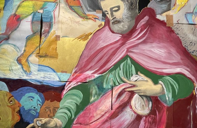Le due tele propongono nuove prospettive visive sull’opera seicentesca, come raccontato da Siria Bertorelli, arteterapeuta e conduttrice del Centro Ticonzero, durante la presentazione: “Abbiamo scelto di lavorare partendo dalla tela dedicata a sant’Omobono, reinterpretandola attraverso due opere collettive. La prima, più figurativa, pensata per coloro che avevano maggiori abilità nella coordinazione oculo-manuale, e la seconda più contemporanea e astratta, in cui il linguaggio espressivo si fa più libero e immediato, per consentire a tutti di partecipare e sentirsi parte del progetto. È stato un lavoro intenso, che non ha coinvolto soltanto il piano artistico, ma anche quello relazionale. Perché realizzare un’opera collettiva significa ascoltare, collaborare, trovare un linguaggio comune. È relazione, è comunità”.