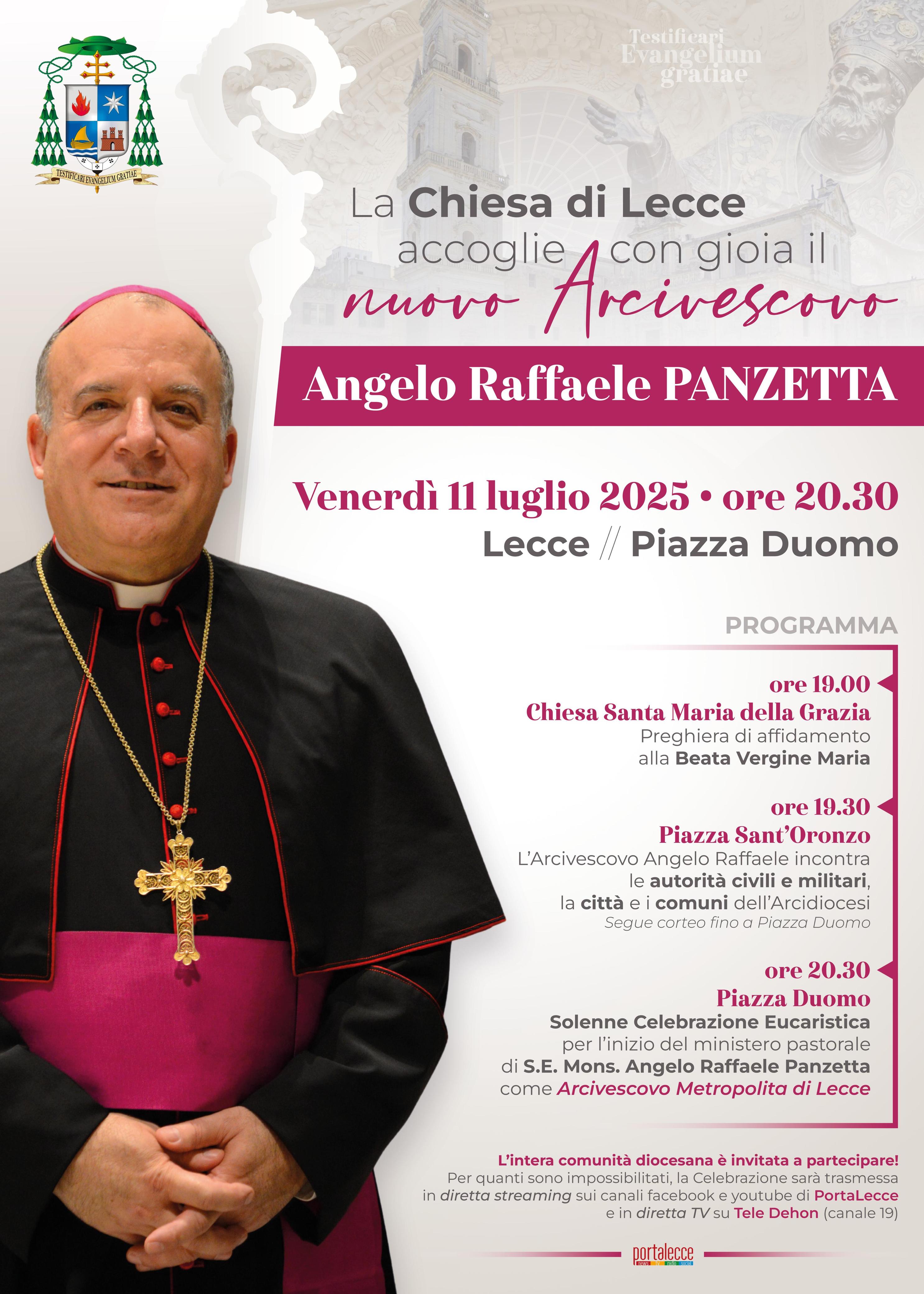 È in programma per la serata di domani, venerdì 13 luglio, la solenne celebrazione di inizio ministero dell’arcivescovo Angelo Raffaele Panzetta a Lecce. Alle 19 il presule si recherà nella chiesa della Madonna della Grazia in piazza Sant’Oronzo per raccogliersi in preghiera e affidare il nuovo ministero episcopale alla Madonna. Poi, verso le 19.30 si muoverà verso il Sedile di piazza Sant’Oronzo per rivolgere un saluto alle autorità della città e ai sindaci dei Comuni della diocesi e ricevere un indirizzo di saluto da parte del sindaco Adriana Poli Bortone, del prefetto Natalino Manno e del presidente della Provincia, Stefano Minerva. Poi partirà il corteo verso piazza Duomo dove, alle 20.30, è prevista la celebrazione eucaristica all’inizio della quale mons. Panzetta riceverà il saluto dell’arcivescovo emerito Michele Seccia e l’omaggio di una rappresentanza di sacerdoti, religiosi e laici della diocesi di Lecce.