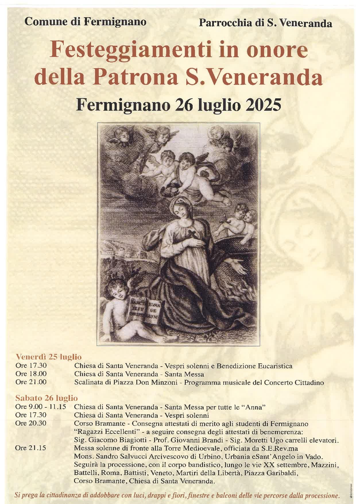 Urbania e Fermignano si preparano a celebrare i rispettivi patroni con solenni liturgie e momenti di forte partecipazione comunitaria. Il 25 luglio Urbania onora San Cristoforo, patrono del paese. I festeggiamenti, preceduti dalla novena e dal Triduo della Madonna dei Portici, entreranno nel vivo giovedì 24 con l’esposizione del SS. Sacramento alle ore 17, seguita dalla messa prefestiva e dai primi vespri solenni. Venerdì 25 luglio, dopo le celebrazioni del mattino e i secondi vespri, il momento più atteso sarà il solenne pontificale delle ore 20,30, presieduto dall’arcivescovo mons. Sandro Salvucci nella concattedrale, cui seguirà la tradizionale processione per le vie del centro. Domenica 27 luglio, come da tradizione, la benedizione delle automobili e degli autisti sarà alle ore 18, seguita da messa e concerto conclusivo alle ore 21. Il giorno successivo, sabato 26 luglio, anche Fermignano renderà omaggio alla sua patrona, Santa Veneranda. Dopo l’inizio delle celebrazioni il 25 luglio, il culmine sarà la messa presieduta dall’arcivescovo alle ore 21 davanti alla Torre medievale. La serata si concluderà con la processione accompagnata dal corpo bandistico.