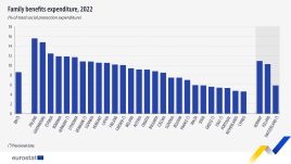 Nel 2022, le prestazioni familiari hanno rappresentato l’8,6% della spesa totale per le prestazioni di protezione sociale nell’Ue, con un aumento di 0,6 punti percentuali rispetto al 2012. “Le quote più elevate di spesa per le prestazioni familiari sono state registrate in Polonia (15,6% del totale delle prestazioni sociali), Lussemburgo (14,8%) ed Estonia (12,4%). Le quote più basse si sono registrate a Cipro (4,6%), nei Paesi Bassi (4,7%) e in Portogallo (5,3%)”. “Le prestazioni di protezione sociale – precisa Eurostat – sono trasferimenti alle famiglie, in denaro o in natura, volti ad alleviare l’onere finanziario di diversi rischi e bisogni. Tra questi rientrano l’invalidità, la malattia/assistenza sanitaria, la vecchiaia, famiglia e figli, la disoccupazione, l’alloggio e l’esclusione sociale non coperti altrimenti”.