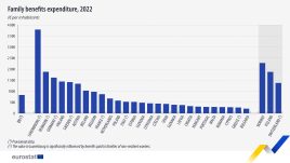 Nel 2022, le prestazioni familiari hanno rappresentato l’8,6% della spesa totale per le prestazioni di protezione sociale nell’Ue, con un aumento di 0,6 punti percentuali rispetto al 2012. “Le quote più elevate di spesa per le prestazioni familiari sono state registrate in Polonia (15,6% del totale delle prestazioni sociali), Lussemburgo (14,8%) ed Estonia (12,4%). Le quote più basse si sono registrate a Cipro (4,6%), nei Paesi Bassi (4,7%) e in Portogallo (5,3%)”. “Le prestazioni di protezione sociale – precisa Eurostat – sono trasferimenti alle famiglie, in denaro o in natura, volti ad alleviare l’onere finanziario di diversi rischi e bisogni. Tra questi rientrano l’invalidità, la malattia/assistenza sanitaria, la vecchiaia, famiglia e figli, la disoccupazione, l’alloggio e l’esclusione sociale non coperti altrimenti”.