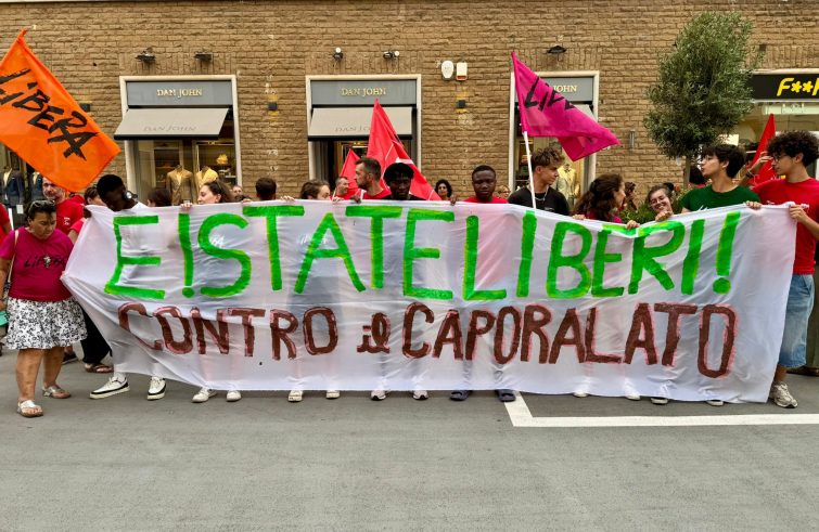 A Latina, Libera e Flai Cgil si sono mobilitati in una azione di denuncia contro il caporalato e lo sfruttamento lavorativo. Nel pomeriggio di ieri, ragazze e ragazzi provenienti da tutta Italia, che stanno partecipando al campo di volontariato di Libera, sul corso Repubblica hanno distribuito simbolicamente cassette di pomodori ai cittadini e alle cittadine : ad ogni pomodoro era legato il nome di una vittima del caporalato nelle campagne italiane, per ricordare le storie di sfruttamento dietro un cibo comunemente consumato sulle nostre tavole. Nomi come Paola Clemente, bracciante pugliese di 49 anni, madre di tre figli, stroncata dal caldo e dalla fatica nelle campagne di Andria, nomi dei 12 braccianti di Ghana, Marocco, Gambia morti in un incidente dopo una dura giornata di lavoro nelle campagne foggiane. Non poteva mancare il nome di Satnam Singh, il lavoratore indiano che venne mutilato nei campi di Borgo Santa Maria, a Latina, e che morì il 19 giugno 2024. Nomi di uomini e donne uccisi da un sistema che calpesta la dignità e i diritti del lavoro per alimentare una filiera fondata sull’ingiustizia, uccisi da un fenomeno che permette alle mafie di incrementare i profitti e di guadagnare milioni di euro grazie allo sfruttamento. L’azione di denuncia rientra in un periodo di mobilitazione che ha visto Libera accanto alla Flai Cgil. I 20 ragazze e ragazzi di Libera, che stanno svolgendo il campo di volontariato itinerante a Roma, hanno partecipato alle Brigate del lavoro di Latina, organizzate dalla Flai Lazio. Alle prime luci dell’alba hanno incontrato lavoratrici e lavoratori che si recavano sui campi, portando bottigliette di acqua, gilet catarifrangenti e volantini informativi e che invitano a rivolgersi ai centri del sindacato.