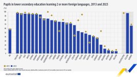 Cresce lo studio delle lingue straniere nelle scuole primarie dell’Ue: tra il 2013 e il 2023, questa quota – riferisce oggi Eurostat – è aumentata di 1,8 punti percentuali, passando da una media del 4,6% del 2013 al 6,4% di alunni della scuola primaria che nel 2023 studiavano 2 o più lingue straniere. In generale, nel percorso scolastico primario e secondario è il 59,5% degli studenti europei che si cimenta con le lingue straniere. Il dato generale per l’Italia è 95,4%. A spiccare nella classifica europea rispetto alla scuola primaria è il Lussemburgo dove il 78,9% dei piccoli studenti studia 2 o più lingue straniere. Al secondo posto la Lettonia (37%), quindi la Grecia (35,5%) e poi l’Estonia (34,9%). Le ore di lezione di lingua straniera sono aumentate in 15 Paesi dell’Ue, e sono diminuite in 8 Paesi dell’Ue (Polonia -6,5%) e Lussemburgo (-4,9%).