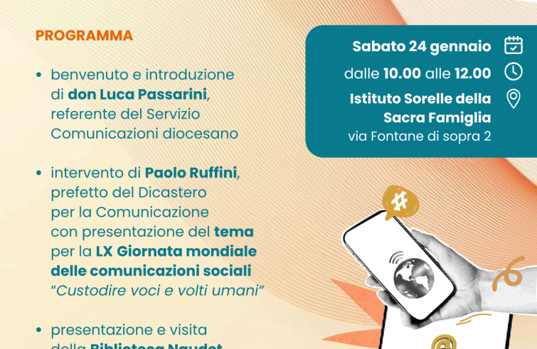 Sabato 24 gennaio, in occasione di san Francesco di Sales, patrono dei giornalisti e operatori della comunicazione, la diocesi di Verona propone un incontro speciale dalle 10 alle 12 presso l’Istituto Sorelle della Sacra Famiglia. Il programma prevede: benvenuto e introduzione di don Luca Passarini, referente Servizio diocesano Comunicazioni; intervento di Paolo Ruffini, prefetto del Dicastero per la Comunicazione con presentazione del tema per la LX Giornata mondiale delle comunicazioni sociali (19 maggio 2026) Custodire voci e volti umani; presentazione e visita della “Biblioteca Naudet, Donne e Fede”; riflessione e benedizione del vescovo Domenico Pompili.
