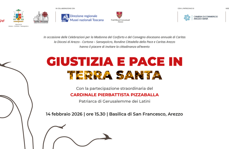 Sarà dedicato alla situazione in Terra Santa, alla condizione dei cristiani e alle prospettive di una pace fondata sulla giustizia, l’incontro “Giustizia e Pace in Terra Santa” in programma venerdì 14 febbraio alle 15.30 nella basilica di San Francesco ad Arezzo. L’iniziativa è promossa dalla diocesi di Arezzo-Cortona-Sansepolcro, da Rondine Cittadella della pace e dalla Caritas diocesana e vedrà la partecipazione del card. Pierbattista Pizzaballa, patriarca latino di Gerusalemme. I lavori si apriranno con i saluti del vescovo di Arezzo-Cortona-Sansepolcro, mons. Andrea Migliavacca, del direttore della Caritas diocesana don Fabrizio Vantini e di Franco Vaccari, presidente e fondatore di Rondine Cittadella della pace. Seguirà l’intervento di don Marco Pagniello, direttore di Caritas Italiana, che proporrà una riflessione sul tema “La ‘pace ostinata’. Educarsi alla pace, affermare la fraternità”. A concludere l’incontro sarà la lectio magistralis del card. Pizzaballa dal titolo “Come ricostruire nuove relazioni di fiducia in Terra Santa”. L’evento è realizzato con la collaborazione della Direzione regionale dei Musei nazionali della Toscana e dei Frati minori conventuali di Arezzo e con il patrocinio della Camera di commercio Arezzo-Siena. L’incontro sarà trasmesso in diretta in tutta la Toscana da Tsd, canale 85 del digitale terrestre, e in streaming all’indirizzo www.tsdtv.it/live.