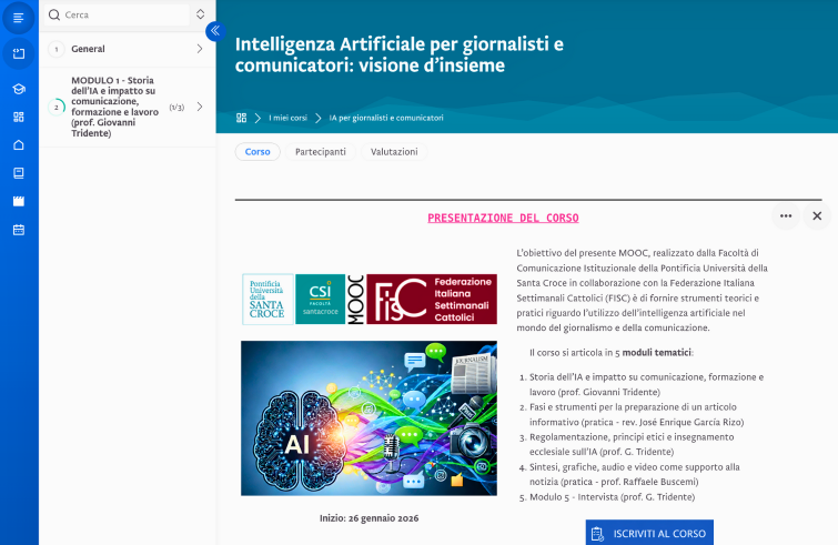Parte oggi a Roma il Mooc “Intelligenza artificiale per giornalisti e comunicatori: visione d’insieme”, promosso dalla Federazione italiana settimanali cattolici (Fisc) in collaborazione con la Pontificia Università della Santa Croce, con 250 iscritti provenienti da tutte le regioni italiane. “La formazione è oggi la vera chiave per abitare il cambiamento”, affermano il presidente della Fisc, Mauro Ungaro, e il decano della Pontificia Università della Santa Croce, Daniel Arasa, sottolineando che il corso nasce per offrire “strumenti concreti e radicati in una visione umanistica della comunicazione, capace di tenere insieme innovazione, verità e servizio al bene comune”. L’iniziativa si colloca nel solco dell’invito di Papa Leone XIV nel Messaggio per la Giornata mondiale delle comunicazioni sociali 2026, nel quale il Pontefice richiama alla formazione sull’intelligenza artificiale e afferma che “la vera sfida non è tecnologica ma antropologica”. Nel Messaggio il Papa esorta comunicatori e giornalisti a non rinunciare al pensiero critico e ricorda che “custodire i volti e le voci umane significa custodire noi stessi”. Il Mooc è proposto dal segretario nazionale della Fisc, Simone Incicco, ed è coordinato da Giovanni Tridente, professore associato di Analisi dell’informazione e direttore della comunicazione della Pontificia Università della Santa Croce. Articolato in quattro moduli, il percorso accompagna i partecipanti dalla comprensione storica e tecnica dell’intelligenza artificiale alle sue applicazioni nel giornalismo, con attenzione alle implicazioni etiche, culturali e sociali.