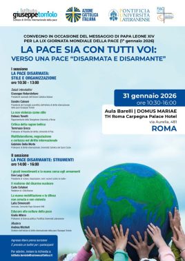 Promosso dall’Istituto di diritto internazionale della pace “Giuseppe Toniolo”, dall’Azione cattolica italiana, dalla Pontificia Università Lateranense e dal Forum internazionale di Azione cattolica (Fiac), il convegno “La pace sia con tutti voi: verso una pace disarmata e disarmante” del 31 gennaio – alla Domus Mariae a Roma, in via Aurelia 481 – intende approfondire l’idea di una pace che non si limiti all’assenza di guerra, ma che assuma il disarmo – materiale, culturale e istituzionale – come criterio di fondo dell’agire politico e delle relazioni internazionali.