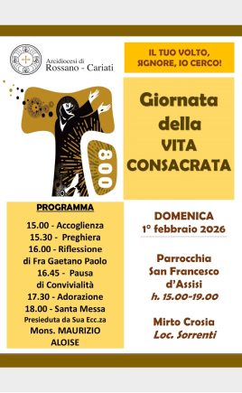 Domenica 1 febbraio, alle 15, nella parrocchia di San Francesco d’Assisi a Mirto Crosia, i consacrati e le consacrate dell’arcidiocesi di Rossano-Cariati si ritroveranno per celebrare la Giornata della vita consacrata con un pomeriggio di preghiera e fraternità. L’incontro, che prevede la riflessione di fra Gaetano Paolo, parroco di Terranova da Sibari, e la messa presieduta dall’arcivescovo Maurizio Aloise, segnerà ufficialmente l’apertura dello speciale Anno giubilare voluto da Papa Leone XIV per gli 800 anni dal transito di San Francesco d’Assisi. La Giornata della vita consacrata, istituita nel 1997 da San Giovanni Paolo II e legata alla festa della Presentazione del Signore, richiama il valore del dono totale a Dio vissuto da uomini e donne consacrati. Nel suo messaggio, mons. Stefano Rega, delegato per la vita consacrata della Conferenza episcopale calabra, ha ricordato le profonde radici spirituali della Calabria, terra segnata dalla testimonianza di santi e comunità religiose, invitando in particolare a testimoniare ai giovani la bellezza della vocazione come scelta di pienezza e di servizio.