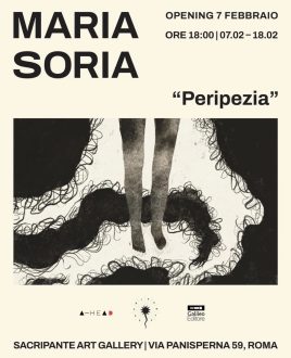 Fino al 18 febbraio la Sacripante Art Gallery di Roma ospita Peripezia, mostra personale di Maria Soria, promossa da A-Head Project di Angelo Azzurro Onlus, in collaborazione con Galileo Editore. La mostra nasce dall’incontro tra A-HEAD Project, per la lotta allo stigma dei disturbi mentali, e Galileo Editore.