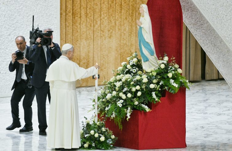 Prima di iniziare l’udienza di oggi, il Papa, dopo aver percorso il corridoio centrale salutando i moltissimi fedeli accalcati lungo le transenne, ha salito i gradini che lo portano sul palco dell’Aula Paolo VI e ha acceso una candela davanti alla statua della Madonna di Lourdes, fermandosi poi in preghiera davanti ad essa e cantando l’Ave Maria nella giornata in cui la Chiesa celebra la Giornata mondiale del malato.