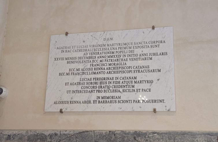 È stata inaugurata questa mattina, nella basilica cattedrale di Catania, la lapide commemorativa che fissa nel marmo lo storico evento dell’esposizione congiunta dei corpi di Sant’Agata e Santa Lucia, avvenuta nel dicembre 2024.
