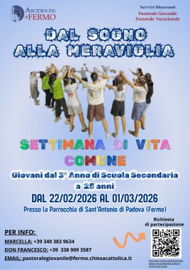Dal 22 febbraio al 1 marzo l’arcidiocesi di Fermo promuove la Settimana di Vita Comune per giovani, dal terzo anno della scuola secondaria fino ai 25 anni. L’iniziativa, dal titolo “Dal sogno alla meraviglia”, è organizzata dai servizi diocesani di Pastorale giovanile e di Pastorale vocazionale e coinvolgerà una ventina di giovani in un’esperienza di convivenza tra studio, preghiera e vita quotidiana. La settimana si svolgerà nei locali della parrocchia di Sant’Antonio di Padova, a Fermo. Per informazioni e iscrizioni: pastoralegiovanile@fermo.chiesacattolica.it.