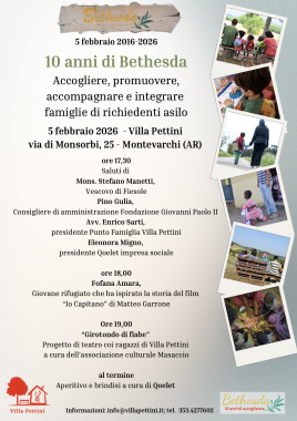 Si terrà il 5 febbraio, a partire dalle 17.30, a Villa Pettini, a Montevarchi, la celebrazione per i 10 anni di Bethesda, il Centro di accoglienza straordinaria nato nel 2016 in risposta all’appello di Papa Francesco affinché ogni comunità cristiana accogliesse una famiglia di profughi. All’iniziativa parteciperà anche Fofana Amara, la cui storia ha ispirato il film “Io Capitano” di Matteo Garrone, che racconterà la propria vicenda di migrante arrivato in Italia dalla Guinea a 15 anni su un barcone, l’arresto iniziale come presunto scafista e il successivo percorso di accoglienza in una comunità per minori a Catania, dove ha potuto riprendere gli studi e avviare un cammino di integrazione. Oggi vive in Belgio e lavora nel settore della logistica. Interverranno, tra gli altri, mons. Stefano Manetti, vescovo di Fiesole, Pino Gulia, consigliere di amministrazione della Fondazione Giovanni Paolo II, Enrico Sarti, presidente di Punto famiglia Villa Pettini, ed Eleonora Migno, presidente di Qoelet impresa sociale. I ragazzi del progetto di teatro di Villa Pettini presenteranno il “Girotondo di fiabe”. Nel corso della serata sarà presentata la pubblicazione “Seminare speranza – Dieci anni di accoglienza a Bethesda”, che raccoglie storie e testimonianze di un’esperienza che continua a proporsi come luogo di misericordia concreta, capace di generare integrazione e legami di comunità. Bethesda è frutto della collaborazione tra Fondazione Giovanni Paolo II, Punto famiglia Villa Pettini OdV e Qoelet impresa sociale e si è caratterizzata fin dall’inizio come una “piccola opera segno”, fondata sulla centralità della persona e sulla scelta di accogliere esclusivamente nuclei familiari. In 10 anni la struttura ha accolto 293 persone, con una permanenza media di 170 giorni; il 42% degli ospiti sono stati minori, con un’età media complessiva di 20 anni.