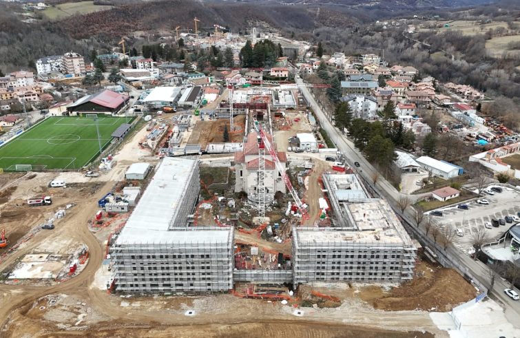 Prosegue e si consolida il percorso di ricostruzione del complesso dell’ex Don Minozzi, dove sta prendendo forma “Casa Futuro”, il progetto ideato da Stefano Boeri Architetti destinato a diventare il più grande cantiere della ricostruzione privata del sisma 2016. Questa mattina si sé svolto un sopralluogo per verificare lo stato di avanzamento dei lavori e fare il punto sui prossimi passaggi. Insieme all’architetto Stefano Boeri (direttore dei lavori insieme all’architetto Corrado Longa), a visitare il cantiere sono stati il Commissario Straordinario alla Ricostruzione Guido Castelli, l’Assessore alla Ricostruzione della Regione Lazio Manuela Rinaldi, il Sindaco di Amatrice Giorgio Cortellesi e don Savino D’Amelio, Presidente dell’Opera Don Minozzi. Dalla visita, riferisce l’ufficio stampa del Commissario Castelli, si segnala l’ormai prossimo completamento della più grande delle corti del complesso, la cosiddetta “Corte dell’Accoglienza”, cuore funzionale della nuova struttura. L’intervento comprende 87 stanze destinate all’ospitalità per più di 150 giovani, un teatro da 300 posti e una mensa da 250 posti: spazi pensati per accogliere comunità, studenti, visitatori e attività collettive. Dopo la sospensione dei lavori tra il 2021 e il 2023, il cantiere è oggi pienamente attivo e tutte quattro le aree a corte previste dal progetto di Stefano Boeri Architetti (Corte Civica, Corte del Silenzio, Corte dell’Accoglienza, Corte delle Arti e del Mestieri) hanno raggiunto la superficie e sono ora visibili. Nel dettaglio, la Corte Civica diventerà un edificio pubblico di 4.760 mq destinato al Comune, la Corte del Silenzio (superficie di 5.670 mq) ospiterà la sede dell’Opera Nazionale per il Mezzogiorno d’Italia (ospitalità religiosa e casa per anziani), la Corte Arti e Mestieri (superficie di 1.150 mq) accoglierà le aree per la formazione, la didattica e start up del territorio. Un secondo risultato significativo riguarda la grande Chiesa di Santa Maria Assunta, collocata al centro del complesso che sarà oggetto di un intervento di consolidamento e recupero invece che di demolizione. Per il Commissario Castelli “Siamo di fronte a un passaggio molto importante, non solo per Amatrice ma per tutto il cratere del sisma. I risultati che abbiamo registrato dimostrano concretamente l’avanzamento del cantiere e che la ricostruzione sta entrando nella sua fase più visibile. Il valore materiale, sociale e culturale di questo luogo lo rende un simbolo della rinascita dell’Appennino centrale: restituire spazi di comunità, accoglienza e socialità significa restituire futuro ai nostri territori. Casa Futuro è un’opera innovativa e sostenibile di qualità assoluta che può davvero dare nuove prospettive di vita, crescita e sviluppo alla comunità amatriciana”. Per l’architetto Boeri si tratta di “uno sforzo collettivo che rappresenta la rinascita di un’intera comunità, a quasi dieci anni dalla tragedia dell’agosto 2016”.