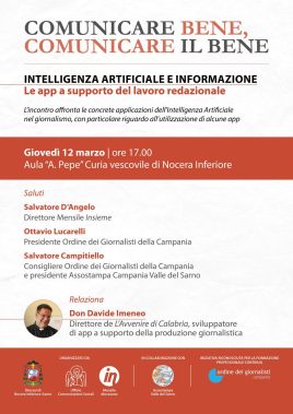 Giovedì 12 marzo, alle 17, nell’aula magna della Curia vescovile di Nocera Inferiore si terrà un nuovo incontro del seminario “Comunicare bene, comunicare il bene”. Il tema del pomeriggio di approfondimento, riconosciuto dall’Ordine dei giornalisti per la formazione professionale continua, è “Intelligenza artificiale e informazione”. Relazionerà don Davide Imeneo, linguista computazionale, giornalista e direttore di Avvenire di Calabria, tra i massimi esperti del tema a livello nazionale.