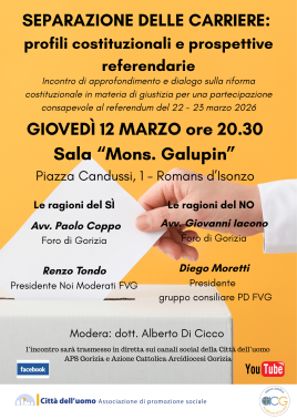Si terrà giovedì 12 marzo, alle ore 20,30 nella Sala Galupin di Romans d’Isonzo (Piazza Candussi 1), l’incontro pubblico “Costituzione e Giustizia”, promosso dall’Associazione Città dell’uomo Aps e dall’Azione cattolica dell’arcidiocesi di Gorizia, in vista del referendum del 22 e 23 marzo sulla riforma costituzionale in materia di giustizia. L’iniziativa nasce per offrire ai cittadini un’occasione di informazione e confronto pluralistico sui contenuti della riforma e sulle sue implicazioni istituzionali, accompagnando a un voto consapevole e responsabile. Nel corso della serata saranno presentate le argomentazioni a favore e contro la modifica costituzionale, in un dialogo aperto che prevede anche uno spazio dedicato alle domande del pubblico. Per le ragioni del “SÌ” interverranno l’avv. Paolo Coppo del Foro di Gorizia e Renzo Tondo, presidente di Noi Moderati Fvg. Per il “NO” prenderanno la parola l’avv. Giovanni Iacono del Foro di Gorizia e Diego Moretti, presidente del gruppo consiliare regionale del Pd-Fvg. La riforma, che tocca l’equilibrio tra i poteri dello Stato, il funzionamento delle istituzioni e la tutela dei diritti, rappresenta un passaggio significativo per la vita democratica del Paese. Con questo appuntamento, i promotori intendono ribadire il valore del dialogo civile e della partecipazione come elementi fondamentali per esercitare pienamente il diritto di voto.