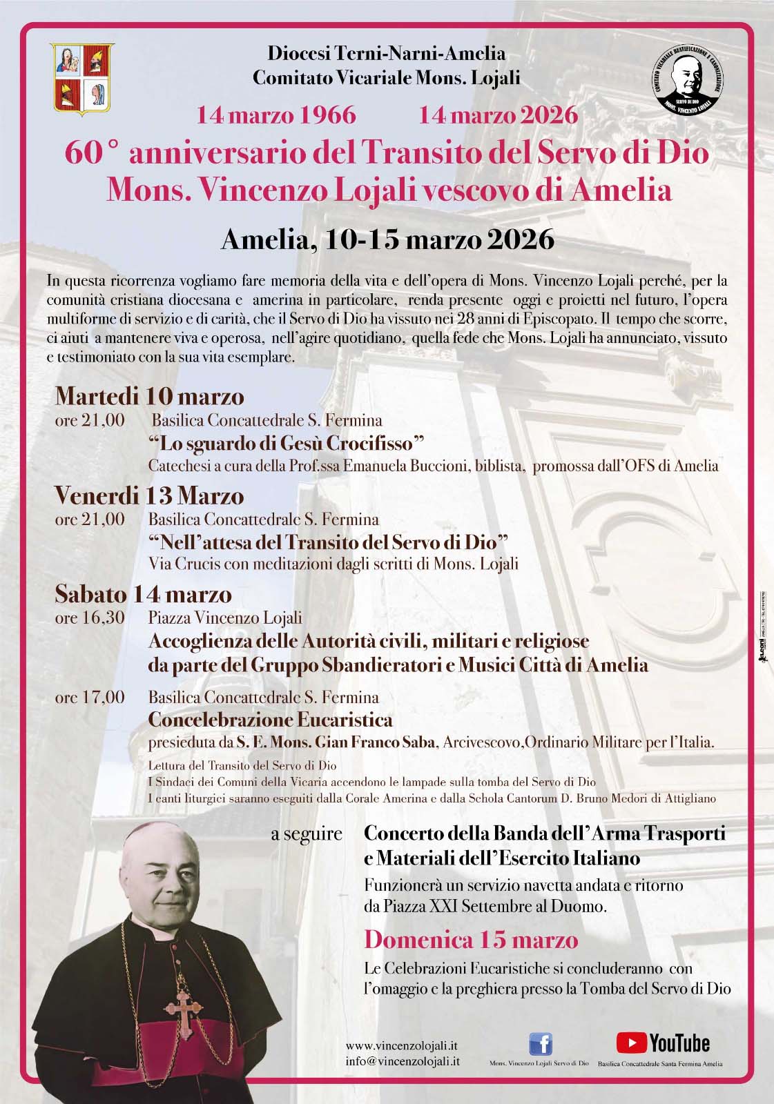 È in programma per oggi, alle 17 nella concattedrale di Amelia, la messa in memoria del Servo di Dio mons. Vincenzo Lojali, nel 60° anniversario della morte dell’ultimo vescovo della diocesi amerina. A presiedere la celebrazione sarà l’arcivescovo e Ordinario militare d’Italia, mons. Gianfranco Saba. L’iniziativa è promossa dal Comitato vicariale per la beatificazione e canonizzazione e intende fare memoria di un pastore profondamente legato alla sua terra, che guidò per 28 anni la più piccola diocesi d’Italia prima dell’unione con Terni e Narni. La cerimonia inizierà alle 16.30 in piazza Vincenzo Lojali con l’accoglienza delle autorità religiose, civili e militari da parte degli sbandieratori e musici della città. Durante la celebrazione i sindaci dei Comuni del comprensorio accenderanno le lampade votive sulla tomba del Servo di Dio. Al termine è previsto il concerto della Banda dell’Arma trasporti e materiali dell’Esercito italiano. Nato ad Attigliano nel 1894, sacerdote dal 1923 e vescovo di Amelia dal 1938 – allora il più giovane d’Italia – mons. Lojali fu anche ufficiale durante la Prima guerra mondiale, dalla quale tornò decorato al valor militare e ferito. Il suo episcopato fu caratterizzato da una forte attenzione ai poveri, alle famiglie e ai sacerdoti, nel segno del motto paolino “Impendam et super impendar”, spendere e spendersi per gli altri. La commemorazione cade a pochi mesi dalla consegna al Dicastero delle Cause dei santi della positio sulla sua vita e sulle virtù, primo passo verso l’eventuale dichiarazione di Venerabile.