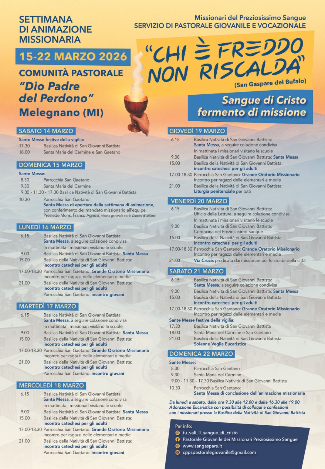 Si svolgerà dal 15 al 22 marzo nella comunità pastorale “Dio Padre del Perdono” di Melegnano, in provincia di Milano, la settimana di animazione missionaria promossa dai Missionari del Preziosissimo Sangue attraverso il Servizio di pastorale giovanile e vocazionale. L’iniziativa coinvolgerà parrocchie, scuole e realtà educative del territorio con celebrazioni, catechesi e incontri rivolti in particolare a giovani, adulti e famiglie. Il tema scelto, “Chi è freddo non riscalda”, riprende una frase di san Gaspare del Bufalo e invita a riscoprire la dimensione missionaria della comunità cristiana. L’apertura è prevista domenica 15 marzo alle 10.30 nella parrocchia San Gaetano con la messa presieduta da mons. Franco Agnesi, vicario generale della diocesi di Milano, durante la quale sarà conferito il mandato missionario all’équipe. Nel corso della settimana i missionari visiteranno le scuole del territorio, incontreranno giovani e adulti per momenti di dialogo e catechesi e guideranno momenti di preghiera e messe. Tra gli appuntamenti principali la Via Crucis per le strade della città, venerdì 20 marzo alle 21, e la veglia eucaristica sabato 21 marzo alla stessa ora. La conclusione è prevista domenica 22 marzo alle 10.30 nella parrocchia San Gaetano. “Nei giorni dell’animazione missionaria abitiamo fisicamente tutti i luoghi della comunità, per cercare di guardare negli occhi e stringere la mano a vicini e lontani”, spiega don Valerio Volpi, Missionario del Preziosissimo Sangue e direttore dell’Ufficio di Pastorale giovanile e vocazionale. “Non veniamo a far da padroni sulla vostra fede – ripetiamo con san Paolo a tutti coloro che ci accolgono nelle loro comunità – siamo piuttosto collaboratori della vostra gioia”, le parole del missionario che conclude: “Non parlare di Dio a chi non te lo chiede – diceva san Francesco di Sales – ma vivi in modo che prima o poi te lo chieda”.