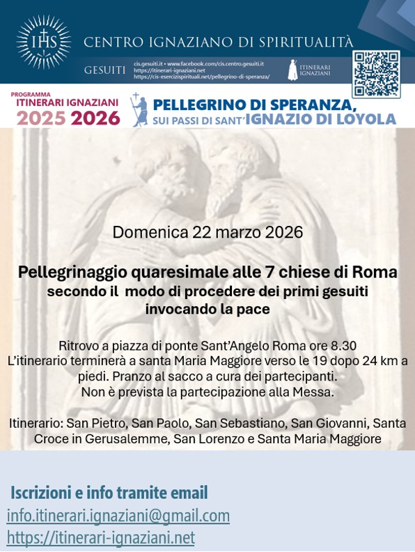 Partirà domenica 22 marzo alle 8.30 da piazza di Ponte Sant’Angelo, a Roma, il “Pellegrinaggio alle Sette Chiese” promosso da Itinerari ignaziani, espressione del Centro ignaziano di spiritualità della Provincia Eum della Compagnia di Gesù. L’iniziativa, proposta nel tempo della Quaresima, invita a percorrere a piedi circa 23 chilometri nel cuore di Roma, attraversando le principali basiliche legate alla memoria degli apostoli e dei martiri cristiani, in un cammino di preghiera e invocazione della pace. Il pellegrinaggio riprende un’antica tradizione della città, ispirata alla pratica dei primi cristiani e dei “pellegrini romei”, e richiama anche il legame con sant’Ignazio di Loyola e i suoi primi compagni, che proprio durante un pellegrinaggio di questo tipo professarono i voti solenni del nascente Ordine dei gesuiti. Nel XVI secolo fu poi san Filippo Neri a trasformare questa devozione in una pratica comunitaria, proponendola come esperienza spirituale condivisa. Il percorso toccherà le 7 basiliche romane, tra cui quelle di San Pietro e San Paolo, San Giovanni in Laterano, San Sebastiano, San Lorenzo fuori le mura e Santa Croce in Gerusalemme, fino all’arrivo previsto verso le 19 alla basilica di Santa Maria Maggiore. “La Chiesa di Roma è la chiesa dei martiri. Qui Pietro e Paolo hanno testimoniato fino alla morte la loro adesione a Cristo. Pregheremo sulle loro tombe per ricordare che possiamo essere testimoni del Vangelo nel quotidiano, ovunque ci troviamo”, spiegano gli organizzatori. Il cammino, aperto a tutti, si svolgerà in un clima di fraternità e semplicità e sarà anche un’occasione per vivere la città come spazio di preghiera, memoria e discernimento spirituale. L’evento è gratuito e si terrà anche in caso di pioggia, salvo allerte meteo gravi.