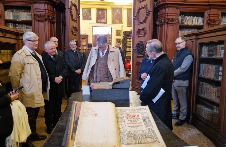 Si è svolta oggi la visita privata a Padova del ministro della Cultura Alessandro Giuli, invitato nei mesi scorsi dal vescovo mons. Claudio Cipolla. La giornata ha previsto un itinerario tra alcuni dei principali luoghi storico-artistici della città, a partire dalla chiesa degli Eremitani fino alla cattedrale, con la visita al battistero e al ciclo di affreschi di Giusto de’ Menabuoi, oggetto di recenti interventi di restauro sostenuti anche da fondi ministeriali. Il ministro ha quindi visitato il Museo diocesano e la mostra dedicata alla “Bibbia istoriata padovana”, per poi proseguire al cantiere della chiesa di Santa Maria in Vanzo, interessata da un intervento finanziato dal Pnrr in vista del futuro “Polo delle biblioteche”. Tappa anche alla Biblioteca monumentale del seminario, dove sono conservati preziosi documenti storici e scientifici, tra i quali la bozza di stampa del dialogo sui massimi sistemi di Galileo Galileo. Nel libro degli ospiti il ministro ha scritto: “Con grande ammirazione e gli occhi pieni di ‘maraviglia’”. Soddisfazione espressa dal vescovo mons. Cipolla: “Siamo stati molto contenti di aver condiviso questa mattinata con il ministro Alessandro Giuli. La Chiesa custodisce un grande patrimonio culturale e artistico che è di tutti e la presenza del ministro avvalora l’impegno che la diocesi di Padova sta portando avanti nel valorizzare questo patrimonio e risponde allo spirito di collaborazione e condivisione con le istituzioni”.