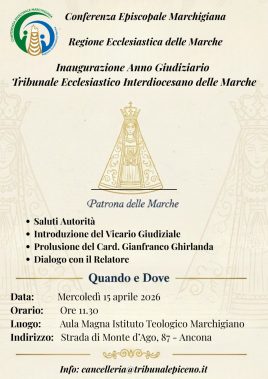 È in programma per mercoledì 15 aprile, alle 11.30 nell’aula magna dell’Istituto teologico marchigiano (strada di Monte d’Ago, 87), ad Ancona, l’inaugurazione dell’anno giudiziario del Tribunale ecclesiastico interdiocesano delle Marche. La prolusione sarà affidata al card. Gianfranco Ghirlanda, patrono del Sovrano militare Ordine di Malta e già rettore della Pontificia Università Gregoriana.