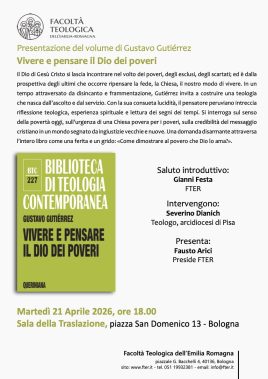 È in programma per martedì 21 aprile, alle 18 nella Sala della Traslazione del convento di San Domenico di Bologna (piazza San Domenico, 13), la presentazione del volume “Vivere e pensare il Dio dei poveri” (Queriniana Editore) di Gustavo Gutiérrez, nell’ambito della rassegna “Appuntamenti attorno a un libro” organizzata dalla Facoltà teologica dell’Emilia-Romagna (Fter) e curata da fra Gianni Festa, docente di Storia della Chiesa della Fter. Dopo il saluto di fra Festa e la presentazione del preside della Facoltà, fra Fausto Arici, interverrà il teologo mons. Severino Dianich, presbitero dell’arcidiocesi di Pisa. La rassegna proseguirà il prossimo venerdì 8 maggio alle 18 con la presentazione del volume “’Preferirei essere chiamato per nome’. Un decennio alla guida della Chiesa di Modena-Nonantola (2015-2025)” insieme a mons. Erio Castellucci, arcivescovo di Modena-Nonantola e vescovo di Carpi.