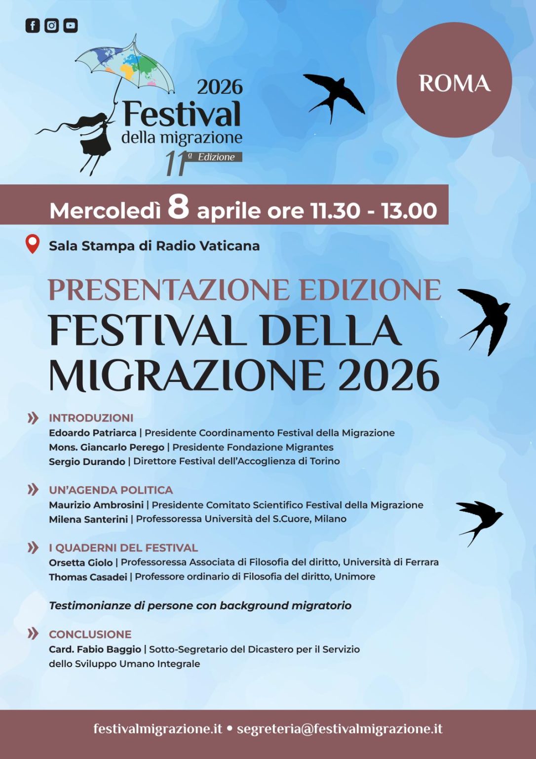 Domani, mercoledì 8 aprile a Roma, a partire dalle ore 11.30 presso la Sala Stampa di Radio Vaticana (piazza Pia 3) verrà presentata l’undicesima edizione 2026 del Festival della migrazione. Dopo gli interventi introduttivi di Edoardo Patriarca (presidente Coordinamento Festival della migrazione), mons. Giancarlo Perego (presidente Fondazione Migrantes) e Sergio Durando (direttore Festival dell’accoglienza di Torino), ci saranno gli interventi di Maurizio Ambrosini (presidente Comitato scientifico Festival della migrazione); Milena Santerini (docente Università del S. Cuore, Milano);