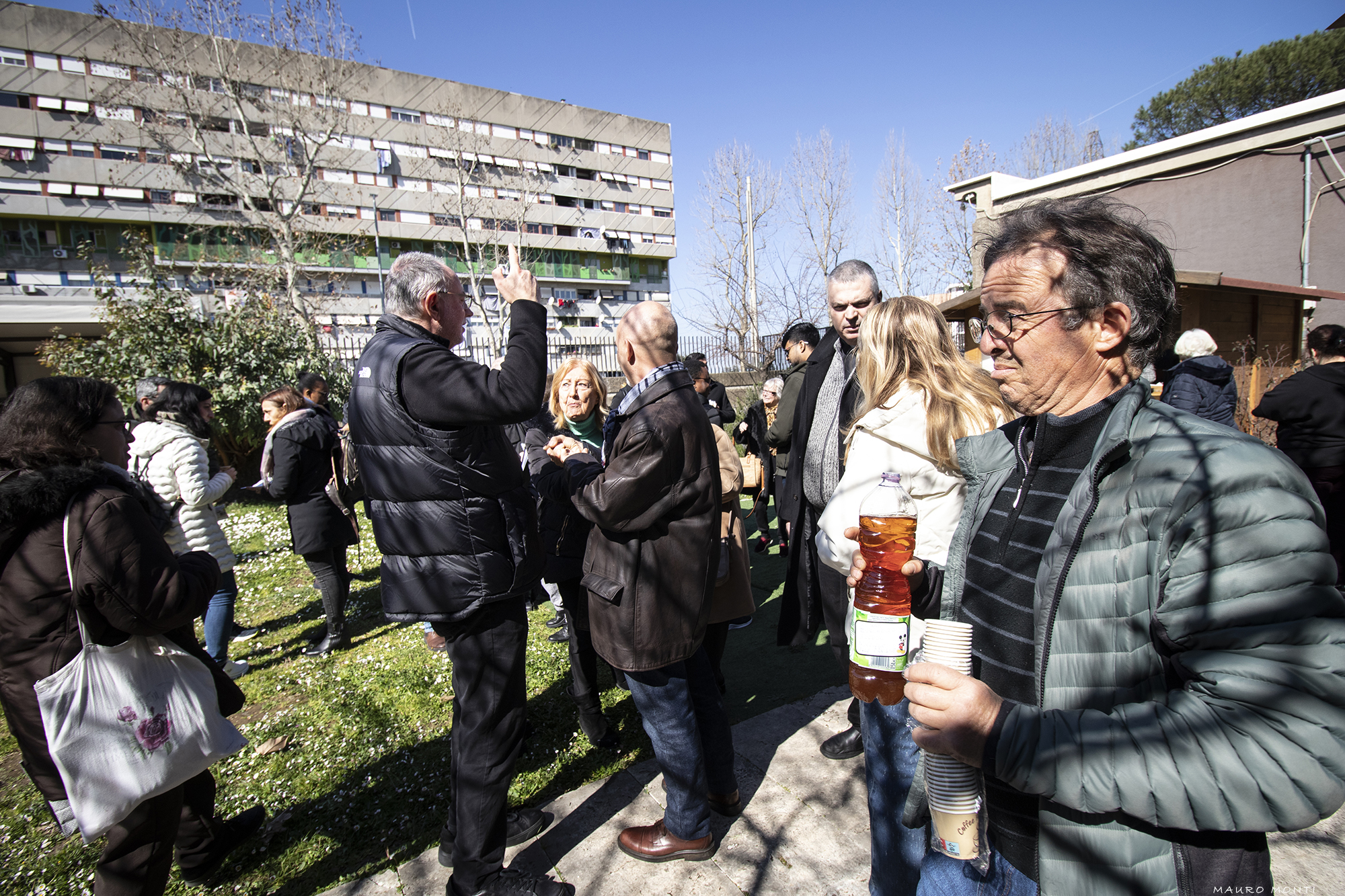 Come incontrare allora le persone, in un quartiere, come Corviale, senza piazze e con un un palazzo unico. Sembra che l’unica piazza del quartiere sia proprio la parrocchia, specialmente dopo Messa nel giardino parrocchiale per un caffè e per stare insieme.