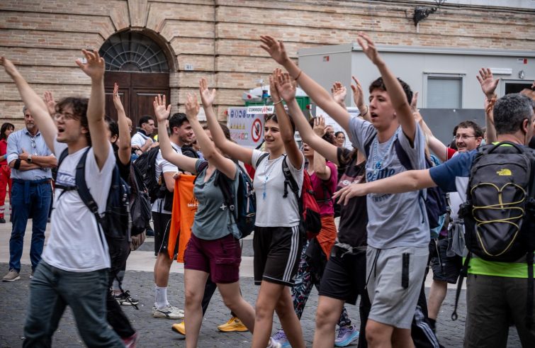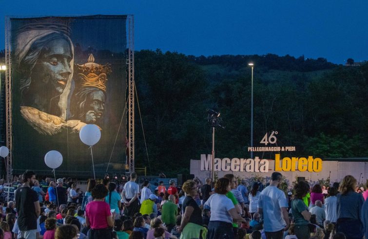 “Come è possibile tutto questo?”. È la domanda del popolo della notte, degli oltre 60mila che, sabato 8 giugno, si sono dati appuntamento per lo storico Pellegrinaggio a piedi Macerata-Loreto, proposto da Comunione e Liberazione. L’edizione numero 46 non delude le attese. Cambiano la location di partenza (il Centro Fiere di Villa Potenza, essendo in via di rifacimento lo stadio Helvia Recina) e la logistica (con circa 4 km in meno di percorso), ma non certo il cuore con cui ci si mette in cammino verso la Santa Casa. Mons. Giancarlo Vecerrica in primis, vescovo emerito di Fabriano-Matelica e instancabile anima di questo gesto, che, nonostante lo scorrere veloce degli anni, da quel lontano 1978 continua a rappresentare una novità straripante di stupore e devozione. È il week end “caldo” delle elezioni europee e amministrative, dei primi assaggi di mare, ma svago e dovere civico non frenano quel desiderio insito nell’animo umano, scandito da un tema alquanto sfidante scelto per il 2024 e acceso dalla Fiaccola della Pace che, retta dai tedofori in corsa, arde sul braciere come segno di fiduciosa attesa. Quella pace ribadita più volte all’inizio dell’evento, in quell’area fieristica già resa speciale, nel 1993, dalla visita di san Giovanni Paolo II. Quella pace che riecheggia nelle video messaggio del card. Pierbattista Pizzaballa, Patriarca di Gerusalemme dei Latini, che sulla guerra tra Israele e Hamas si appella al realismo: “Queste ferite avranno bisogno di molto tempo per essere guarite. La riconciliazione avrà tempi lunghi ma ha bisogno di qualcuno che la proponga, che si chieda, proprio come fate voi questa notte: all’interrogativo ‘Come è possibile tutto questo?’ si aggiunga allora ‘Sia fatta la tua volontà’”.