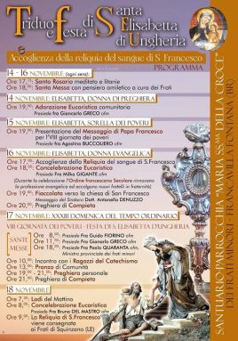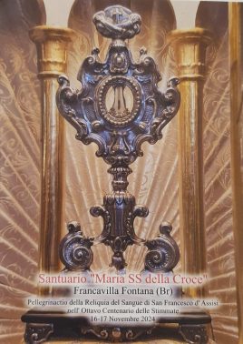 Sabato 16 e domenica 17 novembre, data emblematica, perché non solo si celebra l’ottava Giornata mondiale dei poveri, ma si fa anche memoria di Santa Elisabetta d’Ungheria, patrona dei poveri e del Terz’ordine francescano, la reliquia, che lascerà il Salento a fine novembre, farà tappa a Francavilla Fontana, cittadina in provincia di Brindisi, nel territorio della diocesi di Oria, ricca di chiese antichissime e in cui sopravvivono tuttora tradizioni religiose secolari. Ad accoglierla i Frati Minori del Convento “Maria SS. della Croce”, guidato da fra Giancarlo Greco, entusiasta per la coincidenza “provvidenziale” dell’arrivo del sangue di San Francesco proprio nella festa di Santa Elisabetta, prima canonizzata dopo la morte di San Francesco. “Il sangue è segno della vita – racconta -, la visita di frate Francesco in mezzo a noi dona vitalità al nostro carisma. Lui ci insegna a vivere il Vangelo, a essere frati della gente, come sottolinea Papa Francesco. Lo facciamo da anni: con la mensa dei poveri e la dispensa solidale aiutiamo tantissime famiglie. Siamo presenti vivendo l’amore, la carità, verso la nostra città proprio sull’esempio di Elisabetta, donna dinamica e contemplativa, e di Francesco che ha vissuto dalla preghiera all’azione, dall’azione alla preghiera”.